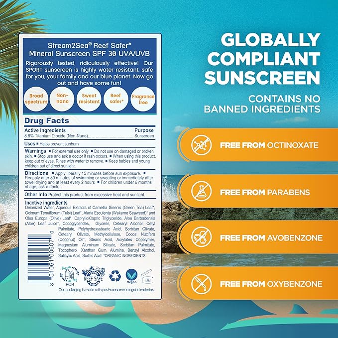 STREAM 2 SEA SPF 30 Biodegradable Mineral Sunscreen, 3 Fl oz Non-Greasy and Moisturizing Reef Safe Sunscreen For Face Protection and Body Against UVA and UVB