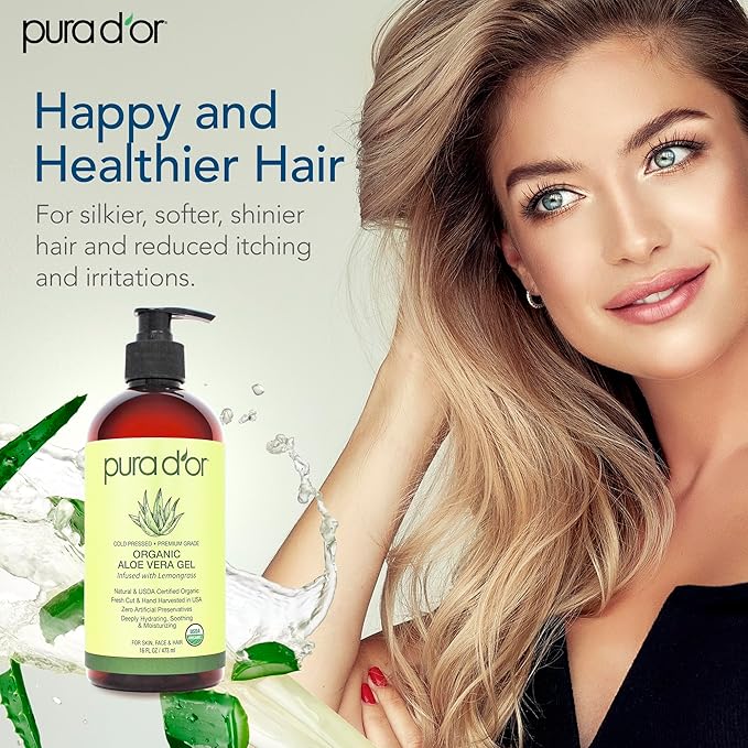 PURA D'OR 16 Oz ORGANIC Aloe Vera Gel - Lemongrass - All Natural - ZERO Artificial Preservatives - Deeply Hydrating & Moisturizing - Sunburn, Bug Bites, Rashes, Small Cuts, Eczema Relief - Skin & Hair