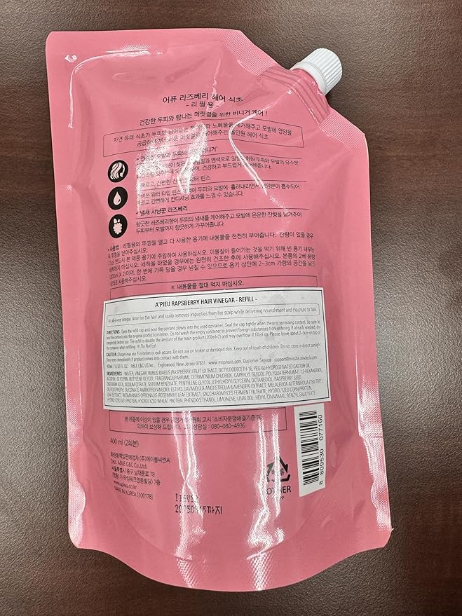 A'PIEU Raspberry Hair Vinegar Rinse Refill 13.6 fl oz - Scalp Treatment for Balanced pH, Shiny Hair | Korean Hair Care I Clarifies & Encourages Growth | Dandruff & Oil Control