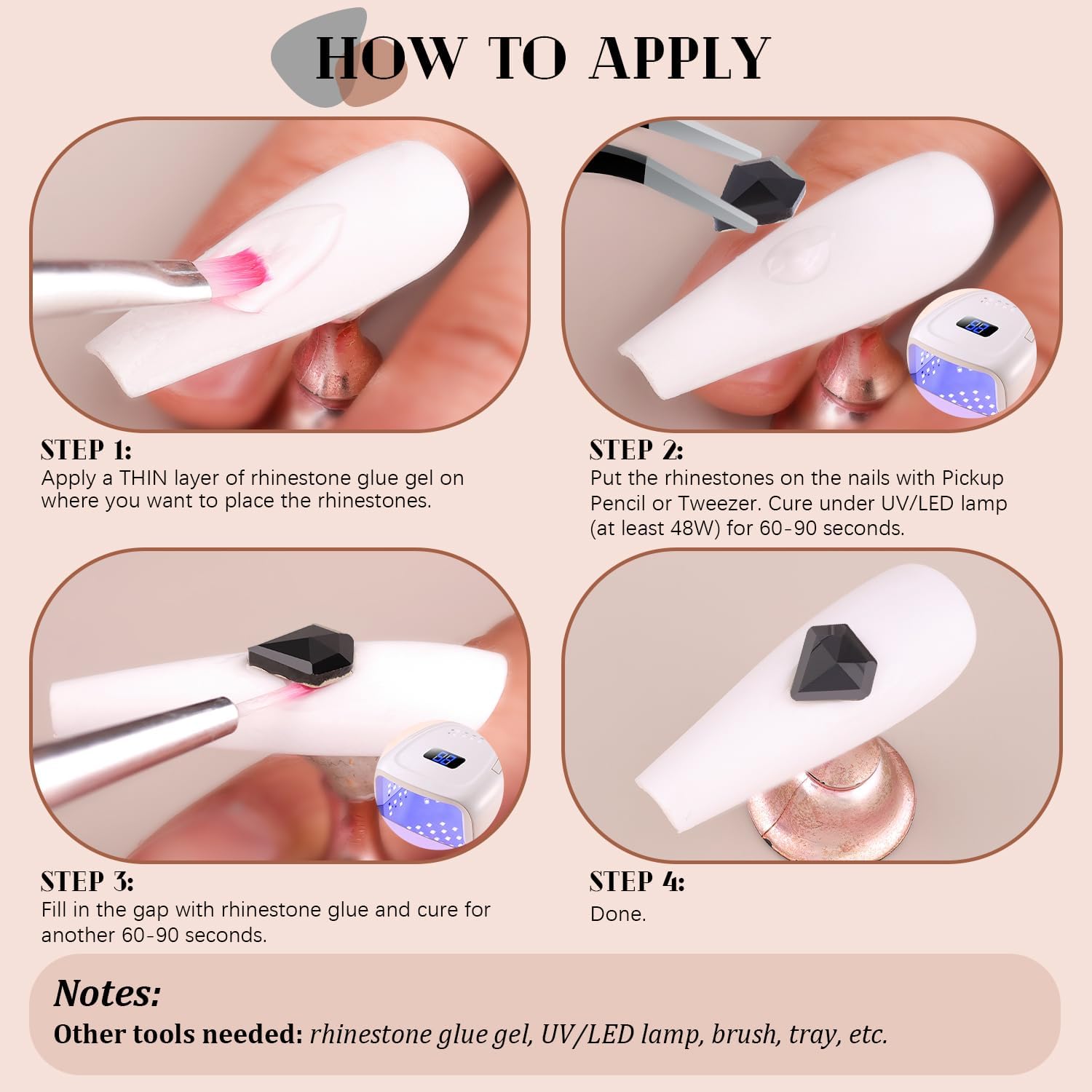 - đEASY TO USE -- Easy to apply on artificial nails. After applying nail polish and applying enough gel on the nails, simply use the equipped tools (pickup pen + tweezers) to pick up the crystals onto your nails to create your fabulous DIY designs! These crystals gemstones are different from those hotfix stones, they are not self-adhesive, you have to apply glue to stick them (glue is not included.)