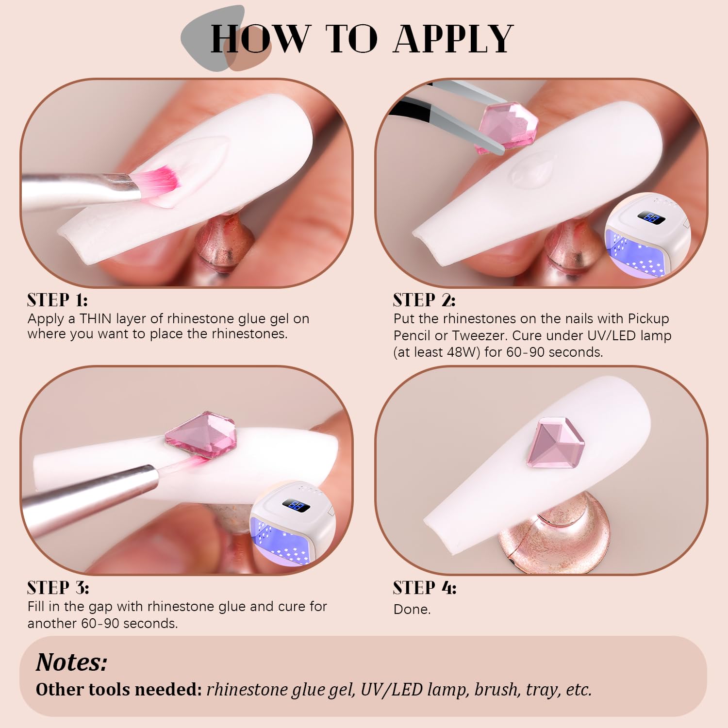 - đEASY TO USE -- Easy to apply on artificial nails. After applying nail polish and applying enough gel on the nails, simply use the equipped tools (pickup pen + tweezers) to pick up the crystals onto your nails to create your fabulous DIY designs! These crystals gemstones are different from those hotfix stones, they are not self-adhesive, you have to apply glue to stick them (glue is not included.)