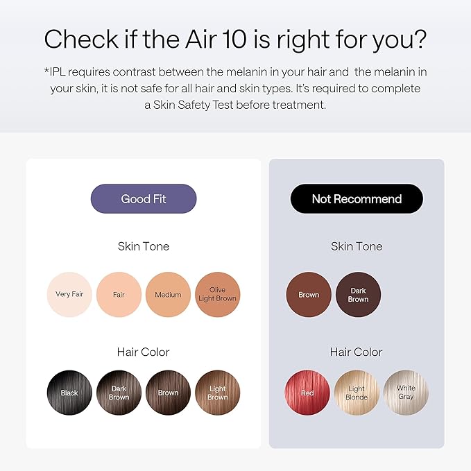 - Skin Protection with SkinSensor Technology: Ulike Air 10 IPL hair removal device comes with SkinSensor, our brand-new skin protection technology, that detects skin tones, auto-adjusts power, and stops flashing if the desired treatment area is deemed too dark for safe application. (Note: IPL technology is not suitable for everyone and every body part. Please refer to our skin tone chart before usage).