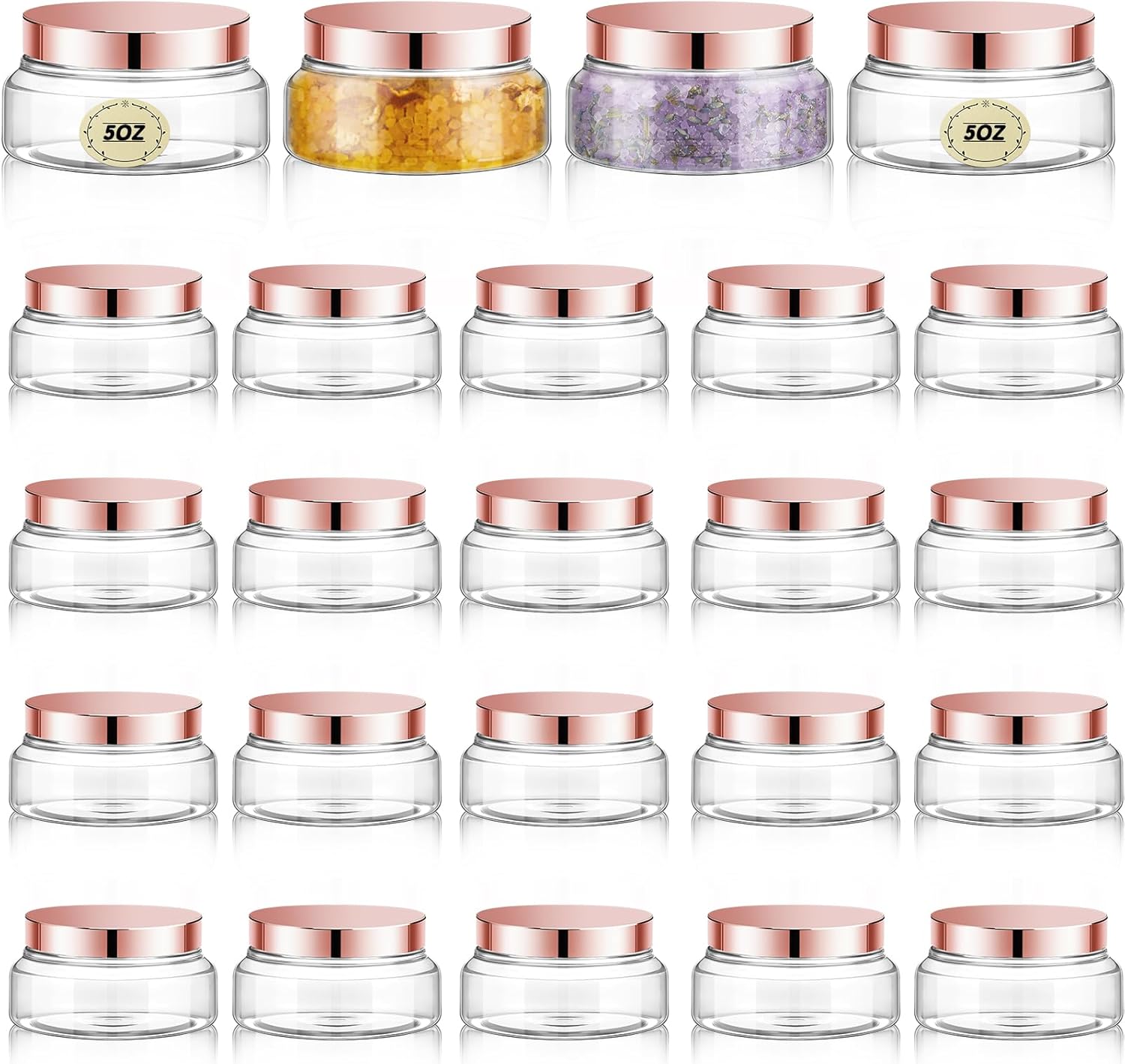 Tessco 24 Pack Plastic Jars with Lids Labels Empty Clear Plastic Jars Round Refillable Cosmetic Containers Body Butter Containers Bulk Sugar Scrub Bottle for Make Up(5 oz,Clear, Rose Gold)