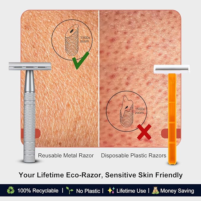 - Eco-Conscious & Built to Last: Shaving with our reusable metal safety razor - a zero-waste essential for eco-friendly shaving. Crafted from long-lasting, fully recyclable metal, this vintage-inspired double edge razor saves money and reduces environmental impact. With the right care and maintenance, it can last a life, aligning with sustainable lifestyles. (No parts to replace, just replace standard safety razor blades) Change the way you shave, choose our single blade razors for men and women
