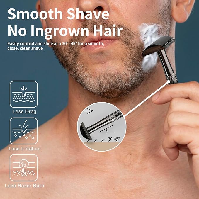 - Sensitive Skin Friendly & Reduces Ingrown Hairs: Say goodbye to razor burns! Gentle yet effective, this double edge safety razor is suitable for all skin types. The safety razor features a single blade that minimizes friction, avoiding the skin damage caused by multiple blades coming into contact with the skin, effectively reducing the risk of follicle damage, making it ideal for sensitive skin