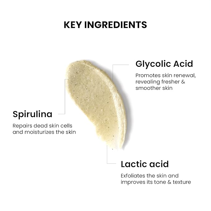 - 🌀 Spirulina Infused for Deep Nourishment Infused with nutrient-rich Spirulina, this exfoliating scrub nourishes your skin while removing impurities. It doubles as a bump eraser for stubborn ingrown hairs and uneven skin tone. The exfoliator promotes cell regeneration and leaves your skin refreshed, hydrated, and glowing after every wash. Suitable for both men and women dealing with dry, bumpy, or textured skin.